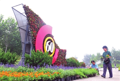 昨天,國慶60周年大型花壇“普天同慶”基本完工,用鮮花等材料構(gòu)建的“60”及“紅旗”亮相朝陽公園東門。這是今年國慶第一個完工的大型花壇,也是城區(qū)公園和環(huán)線要道最具國慶色彩的花壇。