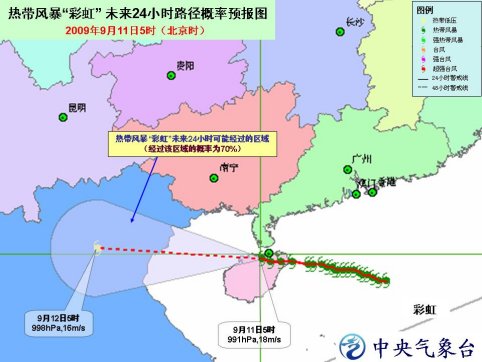 中新網(wǎng)9月11日電 中央氣象臺今日6時發(fā)布臺風(fēng)預(yù)報:今年第13號熱帶風(fēng)暴“彩虹”今日凌晨已經(jīng)在海南登陸,預(yù)計風(fēng)暴中心將以每小時30公里左右的速度繼續(xù)向西偏北方向移動,橫穿海南北部地區(qū),將于今天上午進(jìn)入北部灣東部海面,并可能于今天晚上在越南北部沿海再次登陸。