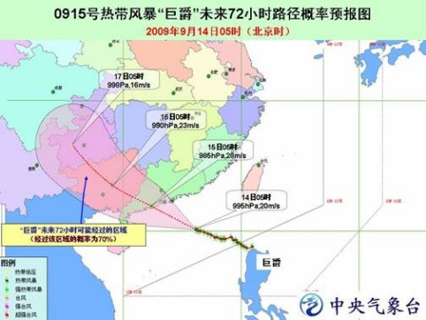 中新網(wǎng)9月14日電 中央氣象臺(tái)今日06時(shí)發(fā)布臺(tái)風(fēng)橙色警報(bào):今年第15號(hào)熱帶風(fēng)暴“巨爵”(Koppu ,名字來源于日本,指巨爵星座)的中心今天早晨 5 時(shí)位于廣東陽江東南方大約 480 公里的南海北部海面上,就是北緯20.1度、東經(jīng)116.2度,中心附近最大風(fēng)力有9級(jí)(23 米/秒)。
