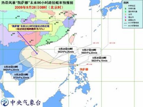 位于菲律賓以東海面的熱帶低壓于26日8時(shí)發(fā)展為今年第16號(hào)熱帶風(fēng)暴,中文名“凱薩娜”,英文名“Ketsana”,(名字來(lái)源于老撾,含義:一種樹),8時(shí)其中心位于菲律賓馬尼拉東偏北方大約190公里的海面上,就是北緯15.2度、東經(jīng)122.7度,中心附近最大風(fēng)力有8級(jí)(18 米/秒),中心最低氣壓為992 百帕。