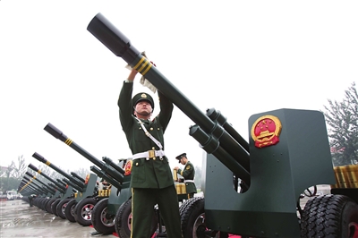 當(dāng)天上午9時(shí)30分,武警北京總隊(duì)某部京郊某訓(xùn)練場(chǎng)。秋雨剛過(guò),訓(xùn)練場(chǎng)上的60門(mén)禮炮(其中4門(mén)為預(yù)備炮)著新刷不久的綠漆,雁翅分開(kāi),昂然而立。9時(shí)40分左右,“就炮!”隨著一聲口令,百余名武警戰(zhàn)士?jī)扇艘唤M站到禮炮后面。