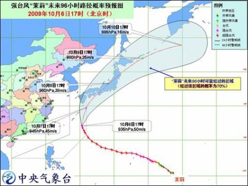 預(yù)計,“茉莉”將以每小時25公里左右的速度向偏北方向移動,7日將轉(zhuǎn)向東北方向移動,強(qiáng)度趨于減弱,并逐漸向日本中部沿?拷