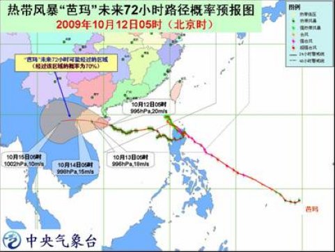 受“芭瑪”和冷空氣的共同影響, 12 日白天到夜間,東海南部、臺(tái)灣海峽、巴士海峽、巴林塘海峽、南海中北部海域、瓊州海峽、北部灣、海南沿海、廣東沿海以及福建沿海、浙江中南部沿海將有 5-7 級(jí)大風(fēng),部分海域或地區(qū)陣風(fēng)可達(dá) 8-9 級(jí);“芭瑪”中心經(jīng)過(guò)的附近海域或地區(qū)的風(fēng)力有 8 級(jí),陣風(fēng)可達(dá) 9-10 級(jí),海南大部和廣東西南部沿海將有大到暴雨,其中海南東部的部分地區(qū)有大暴雨。