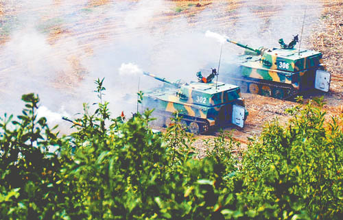 又是一連串震耳欲聾的巨響,“紅軍”前沿攻擊群開始對“藍(lán)軍”兩個高地重要目標(biāo)實施精確打擊。坦克、反坦克導(dǎo)彈車、迫擊炮輪番開火。