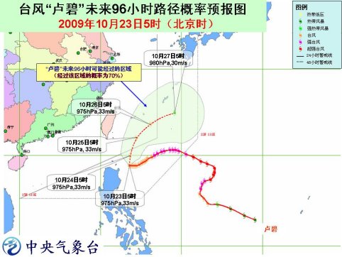 受“盧碧”和南下弱冷空氣的共同影響,23日白天至夜間,臺灣以東洋面、巴士海峽、巴林塘海峽、臺灣東南部沿海將有8-10級大風(fēng),部分海域或地區(qū)陣風(fēng)可達(dá)11-12級;“盧碧”中心經(jīng)過的附近海域的風(fēng)力有11-12級,陣風(fēng)可達(dá)13-14級;臺灣海峽、東海南部、南海東北部、福建中部沿海也將有6-7級大風(fēng),部分海域或地區(qū)陣風(fēng)可達(dá)8-9級;臺灣東北部有大到暴雨,局部有大暴雨。