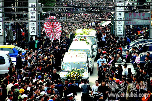靈堂內(nèi),一副副挽聯(lián)寄托著人們無(wú)盡的哀思。3位大學(xué)生的遺體靜臥在鮮花和翠竹中,身上覆蓋著鮮紅的團(tuán)旗。英雄的家屬和同學(xué)們失聲痛哭,許多市民禁不住潸然淚下。全國(guó)道德模范吳天祥從武漢趕來(lái),向三位英雄作最后告別。他哽咽著說(shuō):“他們能在危急時(shí)刻舍己救人,是所有大學(xué)生、廣大人民群眾學(xué)習(xí)的光輝榜樣。”