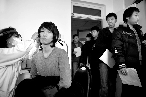 體檢內(nèi)容包括內(nèi)外科中的眼、耳、聽力、身高、體重、心電圖、血尿,以及心理、毒品、艾滋病等多項(xiàng)檢查,在視力檢查室,等待檢查的應(yīng)屆學(xué)生已排起了長隊(duì),主檢醫(yī)生對(duì)應(yīng)征青年視力的各項(xiàng)指標(biāo)進(jìn)行了檢查,包括近視、斜視、色盲等內(nèi)容。主檢醫(yī)生告訴記者,每年因視力不合格的占應(yīng)征者的30%左右。