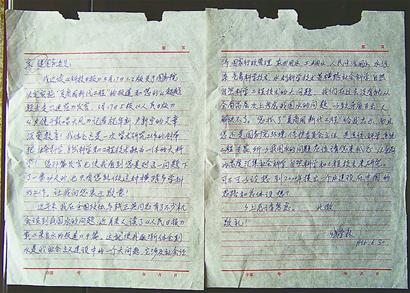 錢學森的這封親筆信共兩頁,圓珠筆書寫,落款時間是1996年6月30日,收信人是當時的國務委員宋健。收藏此信的文敏女士告訴記者,這封信是自己3年前在北京舊書市場上購買到的,當時一起買到的還有幾封名人信札。買回來后,起初也沒有很在意,但后來經過閱讀,才覺出此信具有非常高的價值,便一直珍藏至今。從信中內容得知,錢老不光研究航天科學,對水的問題也很關心,并提出了很好的建議,而這方面以前很少有人提。現(xiàn)在,錢學森的去世讓所有中國人都感到惋惜和悲痛,這時把這封信公布出來,算是自己對老人表達的一份崇高敬意吧。