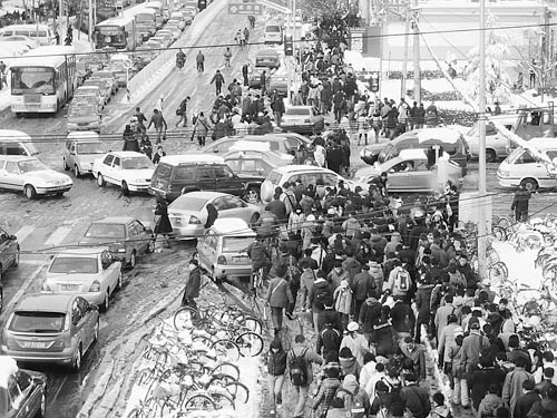 但北京市的公共交通系統(tǒng)仍舊要經(jīng)受大雪的考驗。記者發(fā)現(xiàn),早上8點半時五道口城鐵站附近的路面上已無積雪,車輛行駛較為通暢。但路邊的積水給從城鐵站和公交車站走出的上班族帶來了麻煩,他們小心翼翼地嘗試尋找積水可能比較淺的落腳點,行進速度緩慢,經(jīng)常堵住了垂直方向的車流。現(xiàn)場指揮的交警不停地大聲呼喊著疏導(dǎo)人流和車流,但他的聲音卻總被喇叭聲淹沒。直到10點多,五道口才基本恢復(fù)了原來的秩序,整個早高峰被這場大雪拉長了。