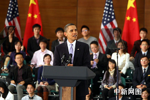 11月16日,美國總統(tǒng)奧巴馬在上?萍拣^與中國青年進(jìn)行對話,復(fù)旦大學(xué)校長楊玉良主持此次對話活動。