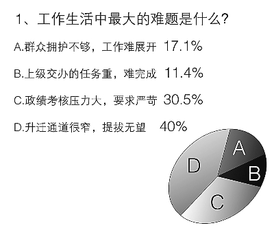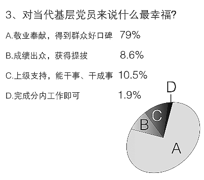 對當(dāng)代基層黨員干部來說,在事業(yè)上什么是最幸福的?根據(jù)調(diào)查,79%的受訪者選擇了“敬業(yè)奉獻(xiàn),得到群眾好口碑”,這說明在基層,群眾工作是最重要的方面。也有10.5%的干部更希望得到“上級支持,有一個‘能干事,干成事’的氛圍”。