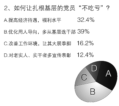 基層比較艱苦,基層比較復(fù)雜,被問到“如何讓扎根基層的共產(chǎn)黨員‘吃苦不吃虧’?”時,39%的受訪者更關(guān)注用人導(dǎo)向問題,他們認(rèn)為應(yīng)該優(yōu)化用人導(dǎo)向,多從基層選拔領(lǐng)導(dǎo)干部;選擇提高經(jīng)濟(jì)待遇,福利水平的也占到了32.4%;值得注意的是,“更重視基層,改善工作環(huán)境,讓其大展拳腳”也受到關(guān)注,有16.2%的受訪者選擇了該選項。