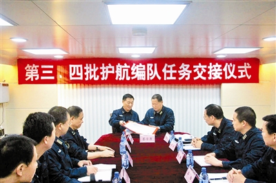 根據(jù)海軍部署,從當(dāng)?shù)貢r(shí)間11月27日1時(shí)開始,中國海軍第四批護(hù)航編隊(duì)正式接替第三批護(hù)航編隊(duì)擔(dān)負(fù)亞丁灣、索馬里海域護(hù)航任務(wù),“千島湖”艦轉(zhuǎn)隸第四批護(hù)航編隊(duì)指揮。交接過程按照編隊(duì)指揮組、政工組、后勤組、裝備組的順序組織實(shí)施。第三批護(hù)航編隊(duì)將相關(guān)文件、物資、器材和備品配件移交給第四批護(hù)航編隊(duì)。第三批護(hù)航編隊(duì)指揮員、東海艦隊(duì)副司令員王志國和第四批護(hù)航編隊(duì)指揮員、東海艦隊(duì)副參謀長邱延鵬在任務(wù)交接書上簽字。