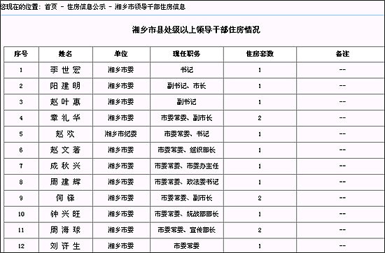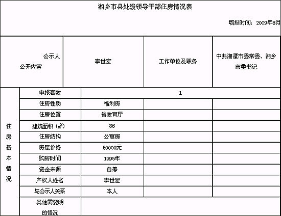 10月初,湘鄉(xiāng)市要求縣處級領(lǐng)導(dǎo)干部對住房情況進(jìn)行申報(bào),申報(bào)內(nèi)容包括自建房、參與單位集資建房、購買福利房、經(jīng)濟(jì)適用房、商品房、租房、出賣和出租房屋的情況,以及住房所在地址、產(chǎn)權(quán)所有人、建筑面積和使用面積、房屋造價(jià)或價(jià)格、付款數(shù)額、資金來源等。