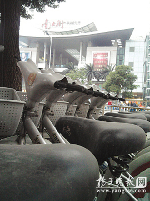 記者昨天在常州市區(qū)多個(gè)免費(fèi)租賃點(diǎn)看見,已經(jīng)停租的免費(fèi)自行車都披上厚厚的“灰衣”,飽受風(fēng)吹日曬的自行車,早已不復(fù)往日的光彩。記者用手指在上面一擦,就能留下印跡。很多車輛被一條銹跡斑斑的鐵鏈鎖住,鎖芯已經(jīng)銹死。有的車輛東倒西歪,車身、座墊等多處被人為劃傷,更有甚者座墊、踏腳等零件都被人拆卸掉了。在南大街,面對(duì)記者采訪,市民王女士搖頭說(shuō),“市中心代表一個(gè)城市的形象,可那些自行車放那,那么臟,又沒有人管。真是給常州丟臉了!