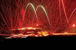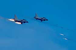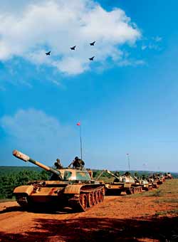 記者在演習(xí)現(xiàn)場(chǎng)看到,在某高地的爭(zhēng)奪戰(zhàn)中,紅藍(lán)雙方拼得異常激烈。拂曉剛過(guò),“藍(lán)軍”15架飛機(jī)從多個(gè)方向同時(shí)出現(xiàn)在“紅軍”空域,準(zhǔn)備對(duì)“紅軍”目標(biāo)同時(shí)發(fā)起攻擊!凹t軍”毫不示弱,偵察飛機(jī)主動(dòng)出擊,出其不意地對(duì)敵情報(bào)預(yù)警系統(tǒng)實(shí)施欺騙性干擾,與此同時(shí),“紅軍”空中攔截兵力強(qiáng)行突防飛抵目標(biāo)上空,朝敵機(jī)猛撲過(guò)去,為奪取局部制空權(quán),與敵機(jī)展開(kāi)了一場(chǎng)生死大戰(zhàn)。瞬間,方圓數(shù)百公里的戰(zhàn)場(chǎng)陡然升溫。爾后,“紅軍”空中轟炸機(jī)群多批次、多架次、不間斷對(duì)敵縱深目標(biāo)進(jìn)行持續(xù)轟炸,使敵指揮機(jī)構(gòu)、通信樞紐等重要目標(biāo)遭到癱瘓性打擊。