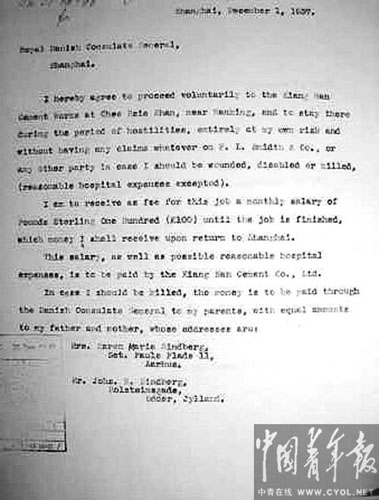 在丹麥,記者收集到的史料還包括:1938年2月7日,F.L.史密斯上海公司女秘書(shū)史丹倫致辛德貝格的信;1938年5月21日、6月9日,就日商調(diào)查中方工廠底細(xì),F(xiàn).L.史密斯公司人員分別從香港、東京致江南水泥廠,標(biāo)明“保密件”或囑“不要讓別人知道”等字樣的函;1938年6月初,辛德貝格在日內(nèi)瓦披露了南京大屠殺真相后準(zhǔn)備移民美國(guó),他于7月4日離開(kāi)奧胡斯時(shí)的答記者問(wèn),等等。