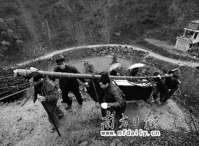 昨日下午,南方日報(bào)記者承租了4輛汽車,輾轉(zhuǎn)鄉(xiāng)村摩的,最后坐輪渡過廖家坪水庫,艱難進(jìn)入山澗中的陰山排村時(shí),村落的峽溪邊哀樂低回,不到1米寬的泥漿路上擺滿黑色棺材,哭聲震徹湖南安化高明鄉(xiāng)連綿的群山。一片青綠下,大山下白衣素裹。