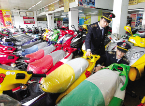 在長寧路一家銷售店內(nèi),擺放著36輛電動自行車,其中20輛的重量超標。銷售人員說:“一般只有裝鋰電池的車不超標,要想達標,除非稱重時拿掉電瓶!