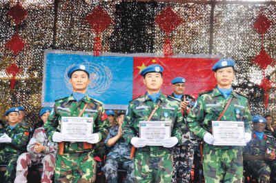 在國際維和戰(zhàn)場上,中國維和軍人還充當了“文化使者”。在蘇丹,維和軍人長期把紅燈籠、中國結、四大發(fā)明和文房四寶的招貼畫等放在營區(qū)展示,還利用國慶招待會、新春招待會、授勛、迎奧運多國運動會等時機,播放反映中國人文風情、改革開放成果的宣傳片。