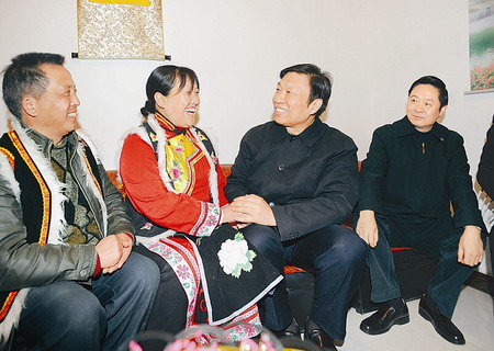 李源潮一下火車,就與同來慰問的省委書記、省人大常委會(huì)主任劉奇葆一起直奔北川縣看望災(zāi)區(qū)群眾,來到剛剛重建起來的擂鼓鎮(zhèn)吉娜羌寨。在地震中羌族同胞劉賢惠失去了丈夫、王孝萬失去了妻子,在當(dāng)?shù)攸h委政府的關(guān)心下,他倆災(zāi)后組成了新家庭,住上了新房子,找到了新產(chǎn)業(yè),過上了新生活,有了新希望。劉賢惠緊緊拉著李源潮的手說:“感謝黨、感謝政府!全靠黨的政策好,讓我們?yōu)暮筮^上了好日子!”李源潮祝愿他們白頭偕老,日子越過越好。