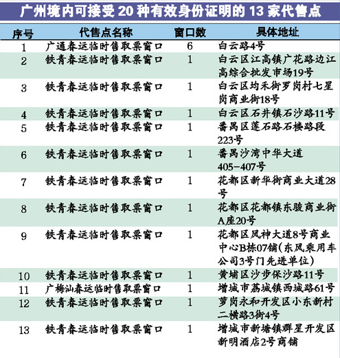 持除二代居民身份證以外的19種有效身份證件購票,在鐵路部門設(shè)立的集中售取票點、車站售票窗口以及廣東境內(nèi)的79家代售點可以購買實名制車票,記者了解到,其中廣州有13家這樣的代售點,大部分分布在白云區(qū)、番禺區(qū)、花都區(qū),其他代售點可以辦理二代身份證購買實名制火車票。