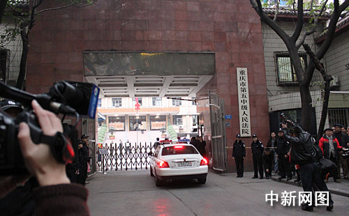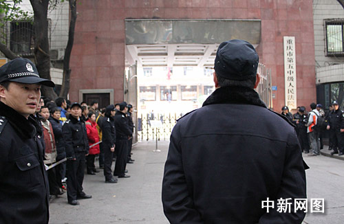 今天一早,中新網(wǎng)記者在重慶市第五中級(jí)人民法院門口看到,雖然法院門口沒有荷槍實(shí)彈的法警站崗,但法院周邊的警力布控比此前的打黑審判更為嚴(yán)密、警力更為密集,記者和旁觀者均禁止靠近法院大門。記者注意到,執(zhí)行任務(wù)的數(shù)十位警察均未佩戴警號(hào)。當(dāng)記者詢問是否與今天受審對(duì)象有關(guān)時(shí),一警察以“不好說”作答。