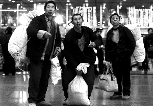 在第三候車室門口,搬運(yùn)工陳師傅拉著空行李車一過來,呼啦一下圍上去二三十人,不到一分鐘,行李車上已有近10個(gè)大包。陳師傅說,現(xiàn)在一天最多跑40趟。