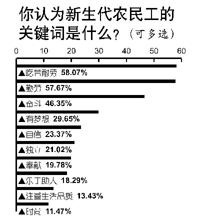 雖然專家指出,新生代農(nóng)民工具有“三高一低”的特征,即受教育程度高,職業(yè)期望值高,物質(zhì)和精神享受要求高,工作耐受力低。但本次調(diào)查中,當(dāng)問到新生代農(nóng)民工的關(guān)鍵詞,“吃苦耐勞”仍以58.1%的支持率排名第一,“勤勞”以57.7%的支持率緊隨其后,排在第三位的是“奮斗”(46.4%)。