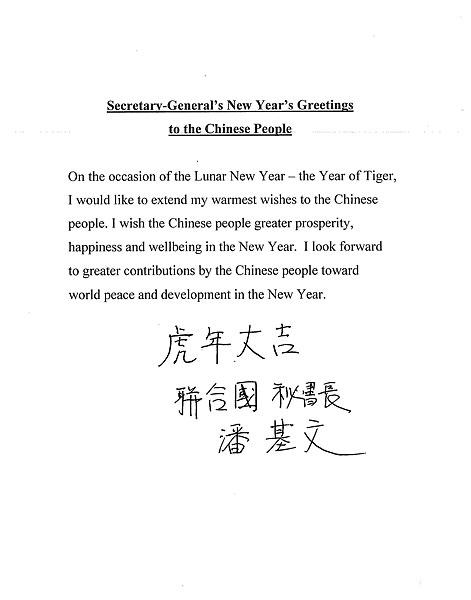 潘基文在用英文發(fā)表的賀詞中說:“值此農(nóng)歷新年‘虎年’到來之際,我謹(jǐn)向中國人民致以最熱烈的祝賀。祝愿中國人民在新的一年里更加幸福安康。我期待著中國人民在新的一年里為世界和平與發(fā)展作出更大貢獻(xiàn)!
