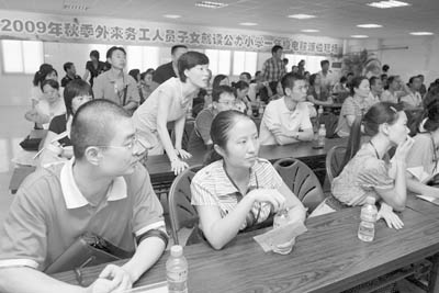 2009年8月26日,福建省廈門市,2009年秋季外來務(wù)工人員子女就讀公辦小學派位現(xiàn)場,家長焦急地看著派位結(jié)果。廈門市思明區(qū)和湖里區(qū)舉行秋季公辦小學一年級招收進城務(wù)工人員子女入學的電腦派位。兩區(qū)共計有3142名進城務(wù)工人員子女被派入公辦小學。
