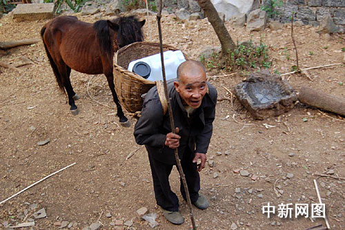 3月27日下午,“下跪門”主角之一、72歲的黃正貴老人背著50斤水翻山越嶺返家。 作 者:劉萬強