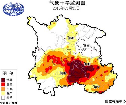 中央氣象臺(tái)預(yù)計(jì),未來十天,西南氣象干旱區(qū)無強(qiáng)降雨過程,大部分旱區(qū)旱情仍將持續(xù)。4月1日至4月2日,西南氣象干旱區(qū)有弱的降雨,降雨量普遍不足3毫米;貴州北部和東部有5~20毫米降雨。4月7日前后,貴州、廣西西北部有陣性降雨,降雨量有3~5毫米。具體預(yù)報(bào)如下: