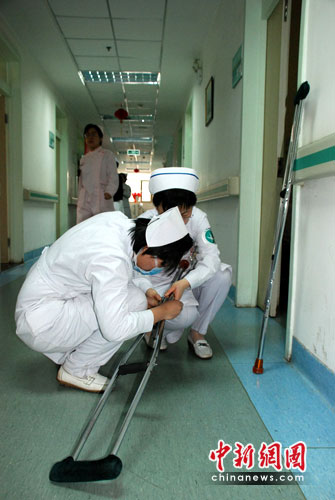 中新網(wǎng)4月12日電( 楊麗紅)近日,在山醫(yī)大一院綜合科病區(qū)接受治療的王家?guī)X獲救工友經(jīng)下肢靜脈B超檢查以及凝血時(shí)間生化等檢查后,各項(xiàng)指標(biāo)顯示無異常,可以由護(hù)士陪同,慢慢下地活動(dòng)了。這是為了預(yù)防長(zhǎng)期臥床的傷員發(fā)生下肢靜脈血栓。