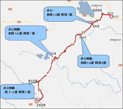 青海省氣象局預(yù)計,今天白天到夜間,青海全省各地多云或晴,其中海南、果洛北部有6到7級西風(fēng),海南的部分地區(qū)有沙塵天氣。沿途天氣對前往玉樹震區(qū)救災(zāi)車輛會有一定影響,請前往災(zāi)區(qū)的救援人員注意防范。