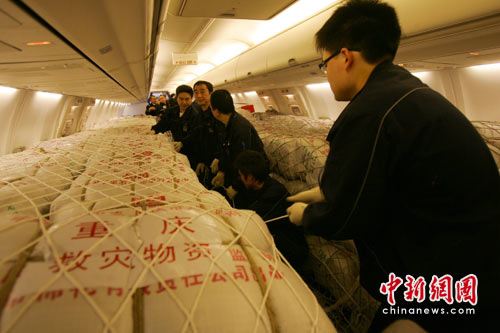 中新網(wǎng)重慶4月15日電 (郭晉嘉 車琳)15日下午,重慶首批救援物資開(kāi)始在重慶江北國(guó)際機(jī)場(chǎng)裝機(jī)準(zhǔn)備啟運(yùn)青海地震災(zāi)區(qū)。當(dāng)日凌晨1時(shí)54分、2時(shí)7分,已先后有兩架載著抗震救災(zāi)官兵和器材的飛機(jī)從重慶江北國(guó)際機(jī)場(chǎng)起飛,帶著重慶人民的深情厚誼飛往青海西寧。