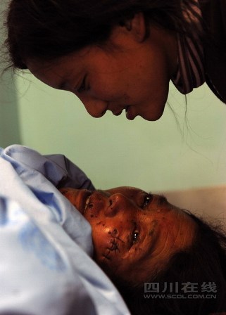 當(dāng)滿載傷員的急救車隊(duì)飛馳在機(jī)場高速時(shí),潘蓮英打開了手機(jī),女兒牟元霞打來電話,“爸爸還好嘛?”“好!我們馬上就到醫(yī)院了。”躺在擔(dān)架上的牟炳學(xué)聽到女兒的問候,再也控制不住自己的情緒,眼淚順著布滿血痂的眼角不停流淌。