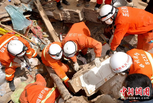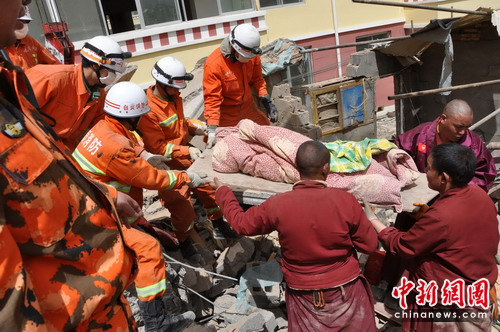中新網(wǎng)成都4月17日電(肖洪環(huán))4月16日,玉樹7.1級地震救援進(jìn)入第三天,也是“黃金72小時”的關(guān)鍵時機(jī),四川消防鐵軍官兵按照溫家寶總理的指示,堅持“救人第一”的原則,利用生命探測儀、搜救犬和“喊、聽、問、看”等方式在廢墟下努力搜尋幸存者,不放過任何一個角落,不放棄任何一絲希望,全力以赴救援,展開了生命大營救,尤其是在縣城扎西巷一個居民樓救援現(xiàn)場發(fā)生的那一幕幕感人致深的場景,讓人們繼“5.12”以來再一次次地感受到人間最偉大的“母愛”,以及救援人員對生命、對逝者、對民族的尊重,在難救援現(xiàn)場處處彰顯出“災(zāi)難無情、人間有情”的“大愛”。