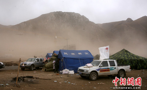 中新網(wǎng)青海玉樹4月19日電(記者劉忠俊)19日14:36分,青海玉樹地震災(zāi)區(qū)天氣突變,由晴天轉(zhuǎn)變?yōu)殛幪,現(xiàn)場掛起了大風(fēng),天空撒起了雨點。