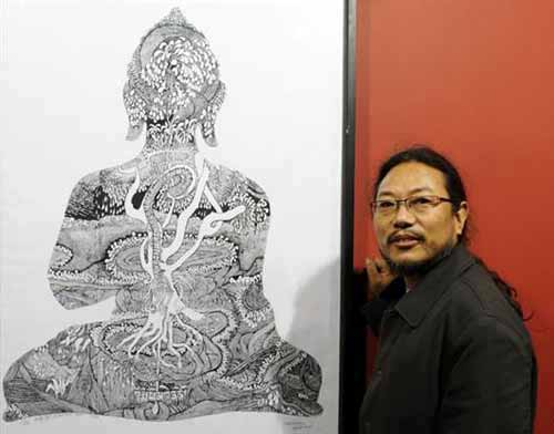 很晚了,我們才坐到飯桌旁,吾要這些天為悼念遇難同胞吃素,不事煙酒,只是溫和地說話。他說世人對(duì)佛的理解有偏頗,以為佛無所不能、護(hù)佑眾生,而他認(rèn)為佛的精義在于教人向善、慈悲、寬容。畫展陳列作品的主角是佛陀,是圣山,圣水,圣靈,這些不是神,是心,是偉大的自然之子——人的本身,是人類尊重生命、善待眾生、敬畏自然、愛護(hù)環(huán)境的藝術(shù)再現(xiàn)和哲理升華。