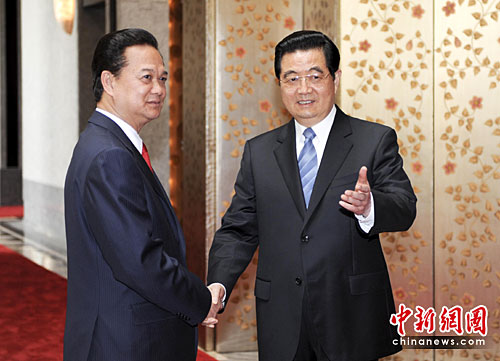 胡錦濤說,不久前,中國青海玉樹發(fā)生強烈地震,造成人民生命財產(chǎn)的重大損失。地震發(fā)生后,阮晉勇總理即來電表示慰問,貴國政府還向我們提供了寶貴援助。我謹代表中國政府和人民向越南政府和人民表示衷心的謝意。