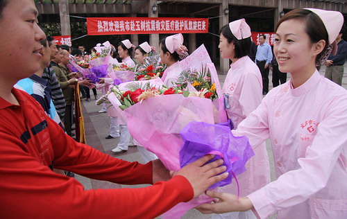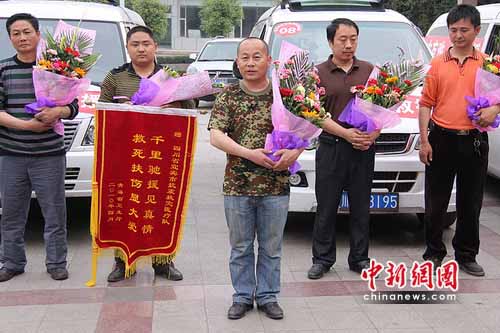 中新網(wǎng)成都4月30日電(蘭鋒)30日下午6時許,四川宜賓高速北站口,家鄉(xiāng)人民用鮮花和最熱烈的掌聲,歡迎圓滿完成青海玉樹抗震救災(zāi)任務(wù)的宜賓醫(yī)療救護(hù)隊凱旋。