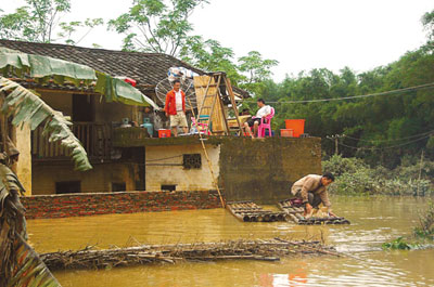 同為翁城鎮(zhèn)的富陂村由于多是土磚房,受災更為嚴重。走進村子,幾乎找不到幾間完整的房子,村民們忙著從斷壁殘垣中找尋著能用的衣物和化肥。富陂村第七小組的村民告訴記者,該組250間房80%都已倒塌,100多村民無家可歸。前天下午,洪水來的時候,多數(shù)村民們已經(jīng)在干部們的勸說下安全撤離,然而,仍有50名群眾被困水中。由于沒有沖鋒舟,鄉(xiāng)鎮(zhèn)干部只能找來竹子扎成竹排來回救人。水流太急,竹排不好使,干部們又找來鐵船,鐵船不聽使喚,干部們只得趟著淹到脖子的洪水拖著鐵船搶救剩下的群眾。