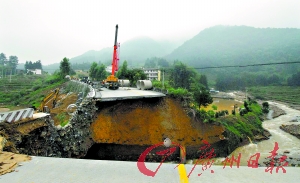 本報(bào)韶關(guān)訊(記者卜瑜 通訊員賴志坡、蔡明清攝影報(bào)道) 位于乳源境內(nèi)的國道323線K426+360處大型涵洞被洪水沖毀。路面出現(xiàn)深達(dá)14.5米的大洞(如圖),被毀路基長90米、路面面積1000平方米,交通中斷。韶關(guān)市政府昨天調(diào)集100多名工人和10多臺(tái)大型機(jī)械日夜搶修,有望今天恢復(fù)通行。