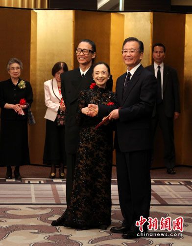 除了池田,獲獎的還有松山芭蕾舞團,前來領(lǐng)獎的是松山芭蕾舞團第二代當(dāng)家,總代表清水哲太郎和森下洋子夫婦。森下洋子見到溫總理,行了一個芭蕾式的驅(qū)腿見面禮,她對溫總理說:“我演過白毛女喜兒!”。溫總理微笑著點頭,說:“我記得你,歡迎你再來中國演出,這也是中國人民的心愿。”