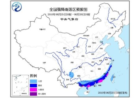 中新網(wǎng)6月25日電 中央氣象臺今日18時發(fā)布暴雨藍色預(yù)警:預(yù)計,6月25日20時到6月26日20時,浙江東部、福建東部和南部、廣東大部、廣西中南部、臺灣大部有大雨或暴雨,局地有大暴雨;上述部分地區(qū)并伴有短時雷雨大風(fēng)等強對流天氣。另外,云南東北部的局部地區(qū)有大雨。