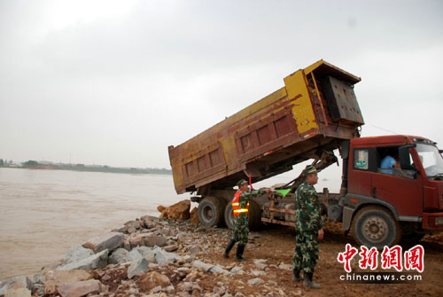 離決堤口不遠,武警水電部隊設立了臨時指揮部,再往前有武警戰(zhàn)士在指揮車輛卸倒石料,大塊大塊的礦石落入水中,砸起一朵朵浪花,旁邊還停留了一艘水文部門的監(jiān)測船。