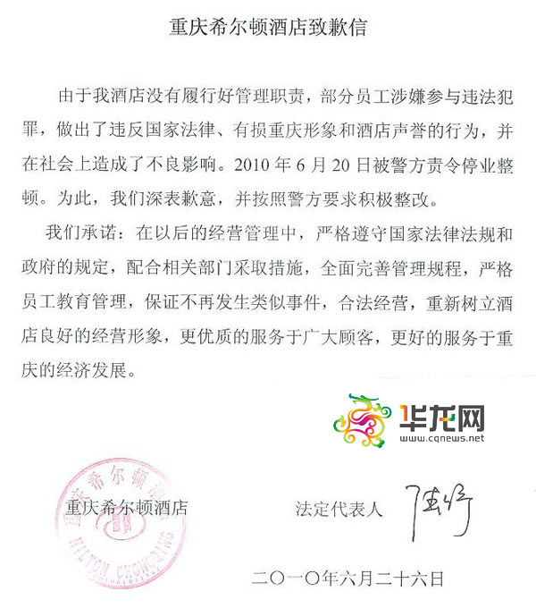 2010年6月20日,重慶希爾頓酒店因股東涉黑,介紹、容留婦女賣(mài)淫,違法經(jīng)營(yíng)和故意擾亂社會(huì)秩序,被重慶警方責(zé)令停業(yè)整頓。今日16時(shí)40分,重慶希爾頓酒店法定代表人陸紓,通過(guò)華龍網(wǎng)記者就此事公開(kāi)發(fā)表致歉信,承諾合法經(jīng)營(yíng),更好地服務(wù)重慶經(jīng)濟(jì)發(fā)展。