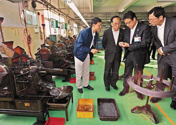 曾蔭權(quán)12日與香港5大商會(huì)代表舉行早餐會(huì),聽(tīng)取他們對(duì)企業(yè)方面的意見(jiàn),下午即前往東莞實(shí)地考察當(dāng)?shù)馗凵痰那闆r。他在東莞市長(zhǎng)李毓全的陪同下,先到東莞鳳崗鎮(zhèn)一間五金制品廠參觀,該港資企業(yè)于1977年成立,聘有千多名員工,接著與約20名珠三角港資企業(yè)代表舉行座談會(huì),進(jìn)一步了解他們現(xiàn)時(shí)面對(duì)的營(yíng)運(yùn)困難。返回香港后,他于傍晚舉行記者會(huì)。