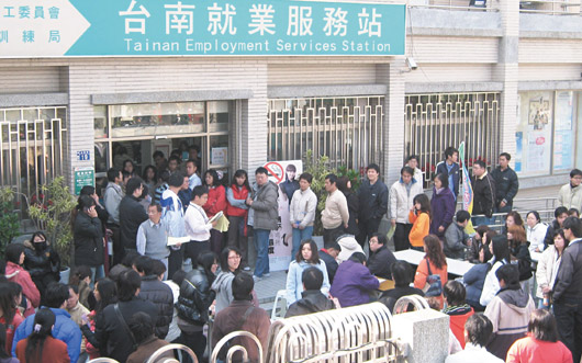 昨天各地就業(yè)服務(wù)站被擠爆,“勞委會”緊急將服務(wù)時間延長兩小時到晚上七點。據(jù)統(tǒng)計,十一個大型就業(yè)服務(wù)站一天內(nèi)涌進一萬六千人,是去年春節(jié)后第一天一千五百人的十倍多,其中近八成、約一萬兩千八百人請領(lǐng)失業(yè)給付,激增三十倍,去年開春后第一天只有四百四十人。